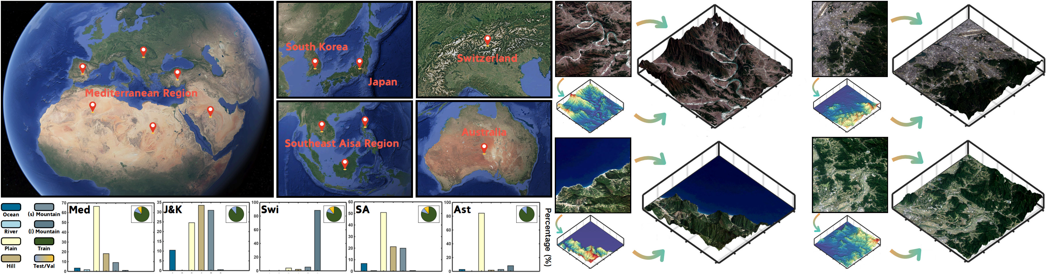 The figure shows the locations of the five data sets we used, and the generation effects of the model. They are: Japan + Korea (2,650 pairs, coastal mountainous terrain, 30 m resolution, J&K), Southeast Asia (7,000 pairs, plains and hills, 30 m resolution, SA), Mediterranean (29,225 pairs, desert and plateau, 30 m resolution, Med), Australia (1,249 pairs, plain, 5m resolution, Ast), Switzerland (4,827 pairs, mountain, 2m resolution, Swi).